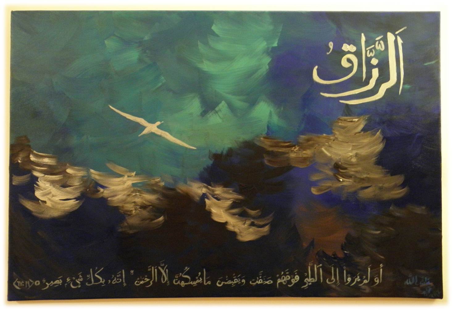 So the painting is about that. That for every bird out there in the ocean, each albatross on its solitary journey for miles and miles and months and months, ar-Razzaq, The Provider, is watching over and will sustain and nourish as needed. This reminded me of a beautiful ayah (verse) in the Quran, which mashaAllah I put at the end of the painting. It is ayah 19 of one chapter 67. A chapter that is considered to have many healing properties in its recitation.
