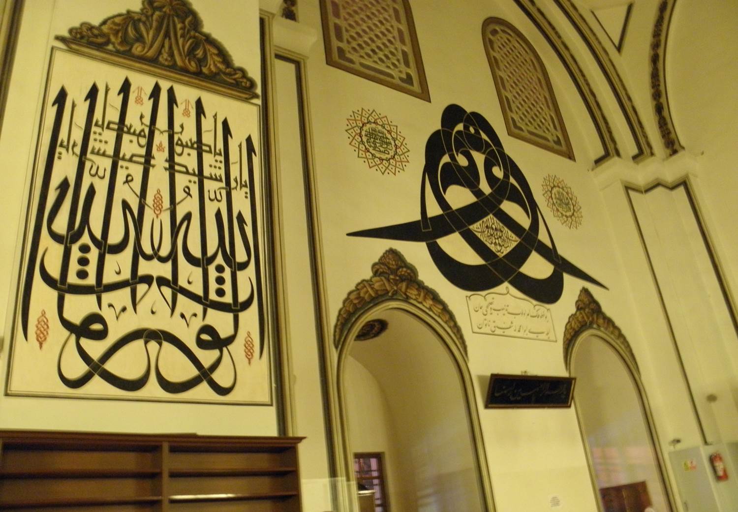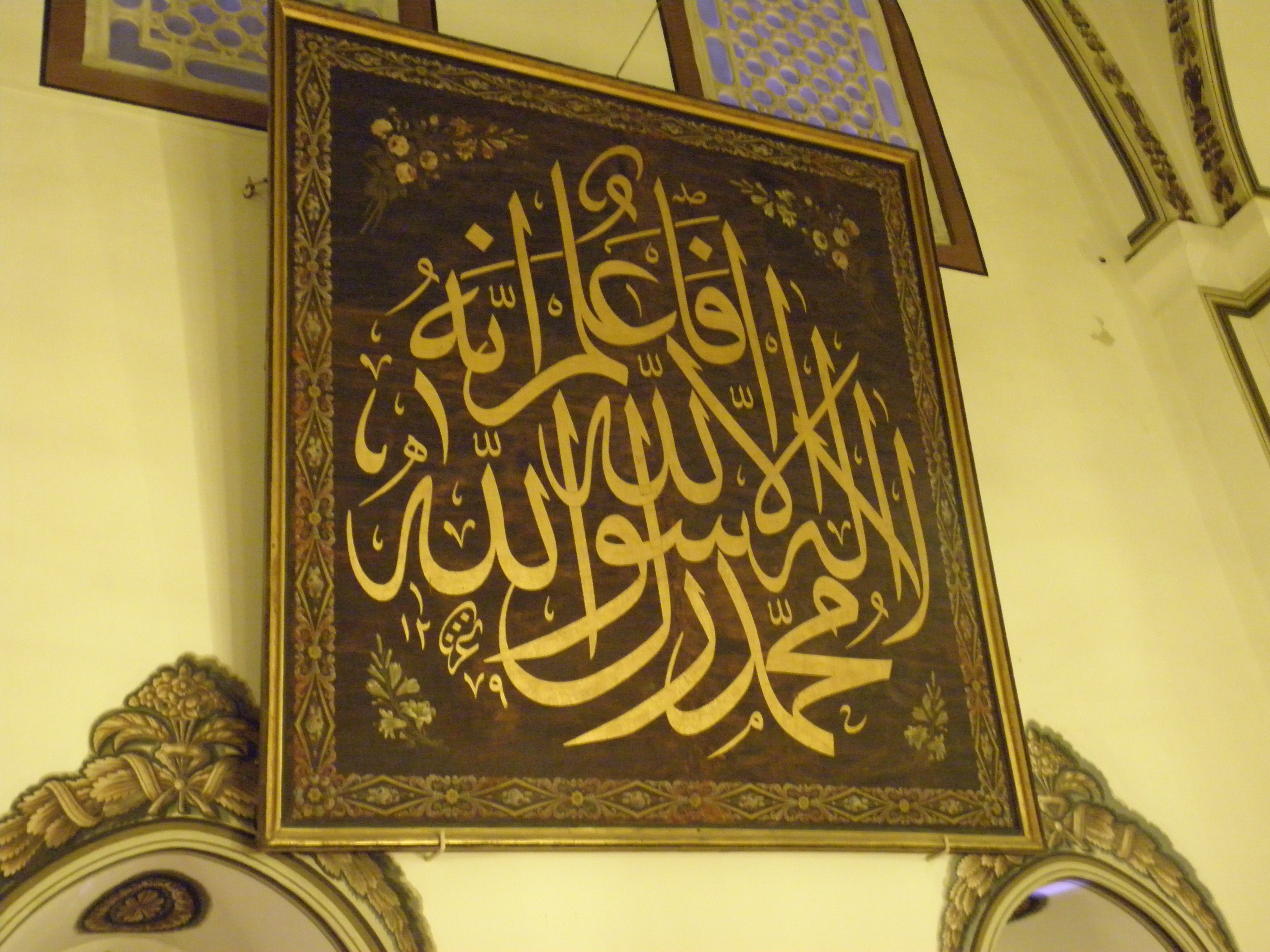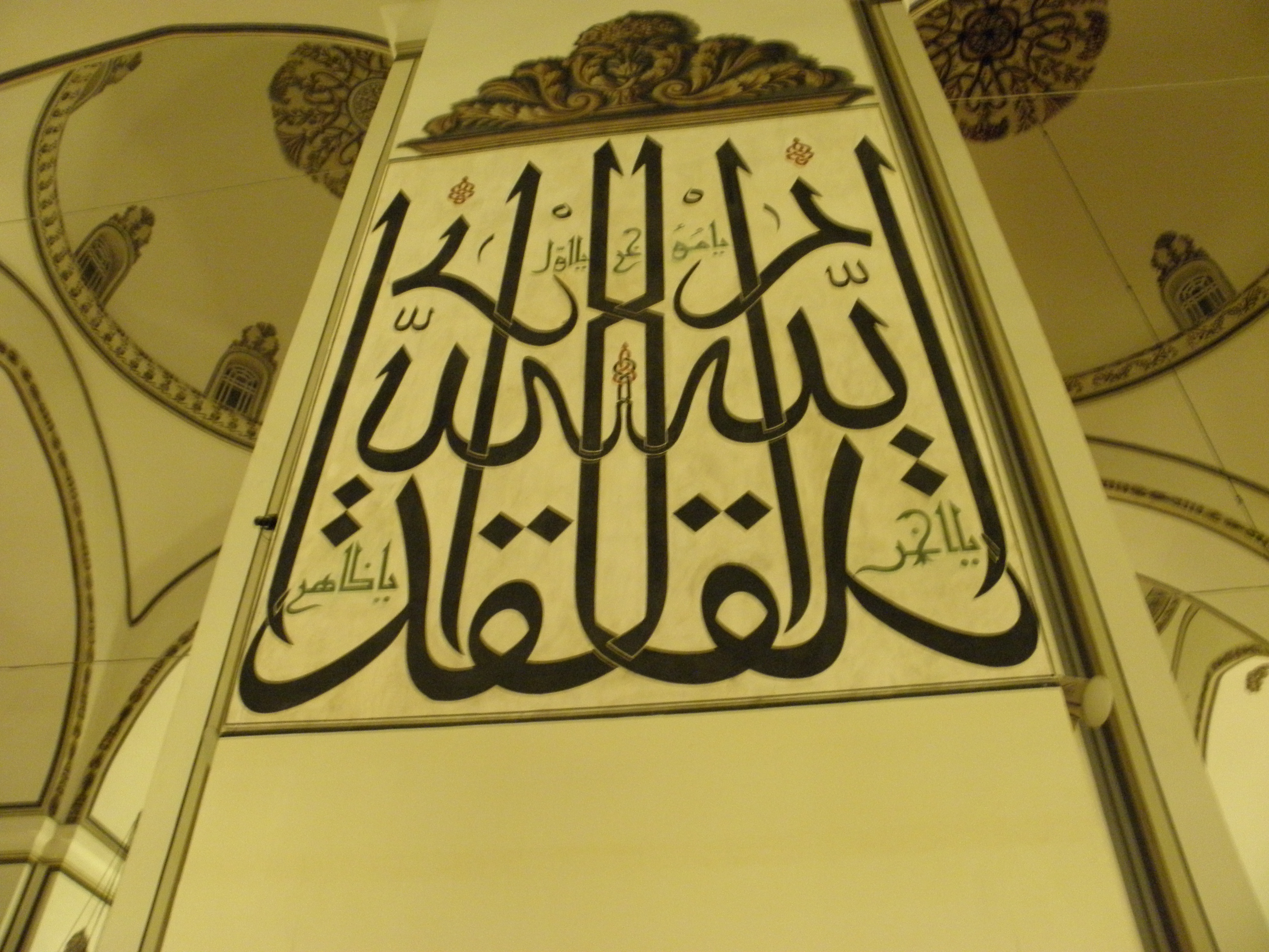 Why is this masjid (=mosque) special? Well, when you see the pictures you will know. We took a day trip down just to see it and were blessed to join the congregation for the noon, afternoon and sunset salah (respectively called ‘dhuhar’, ‘asr’ and ‘maghreb’) there before heading back to Istanbul. It is located in Bursa, a ski-station actually, a beautiful old city located high up in the mountains, overlooked by the towering Ulu-daag (Ulu mountain). The mosque unlike the later masajid (plural of masjid) is decorated in only two colours; black and gold. There is minimal tile work and ornamentation. But what it does have is considered by some as one of the most magnificent displays of Islamic calligraphy in one place. It has over 190 calligraphic panels and works painted on the walls of the mosque. Different verses of the Quran, Islamic phrases, saying of the prophet (peace be upon him). All done in a variety of the established classical styles of calligraphy. For those of you who don’t know, Islamic calligraphy has some classical styles and training in them is also handed down from teacher to student and follows the same ‘ijaza’ (=license) system of transmission. We were blessed to watch a master calligrapher at work, who has ijazaath (plural of ijaza) in I think all the major forms, and some forms took up to 13 years to master. Islamic calligraphy is very mathematical as most Islamic art forms are …unsurprising as Muslim science always considered math to be a language of knowing the divine…there are secrets of the Universe mathematical principles can unlock that no other science can. And I guess in today’s language quantum physics and allied sciences are what I would also consider pure mathematics. But I am going off on another tangent, so I better stop. Look at this interesting paper for a computer application developed to do what the old masters did by hand, exploring symmetry and how it teaches us meanings about origin and end… Here is more detail on the theory.