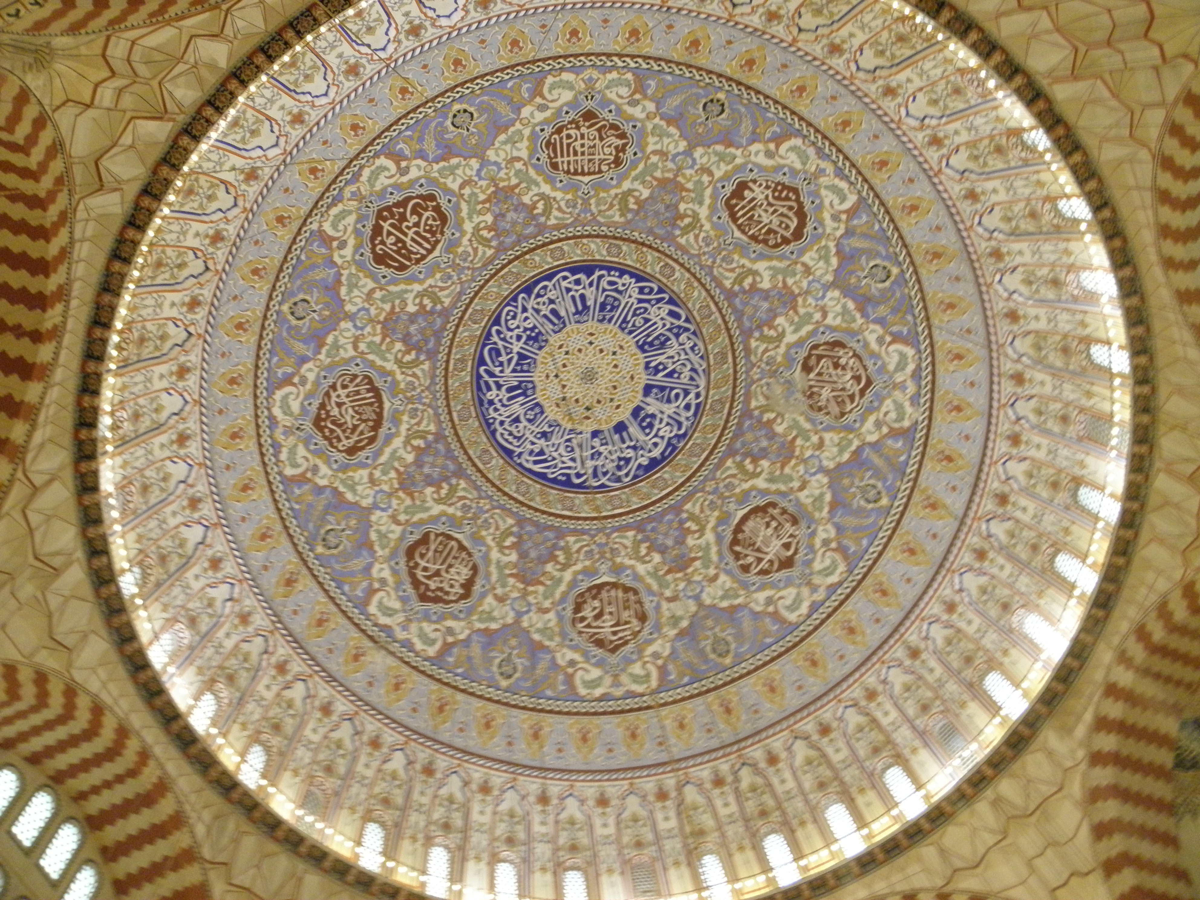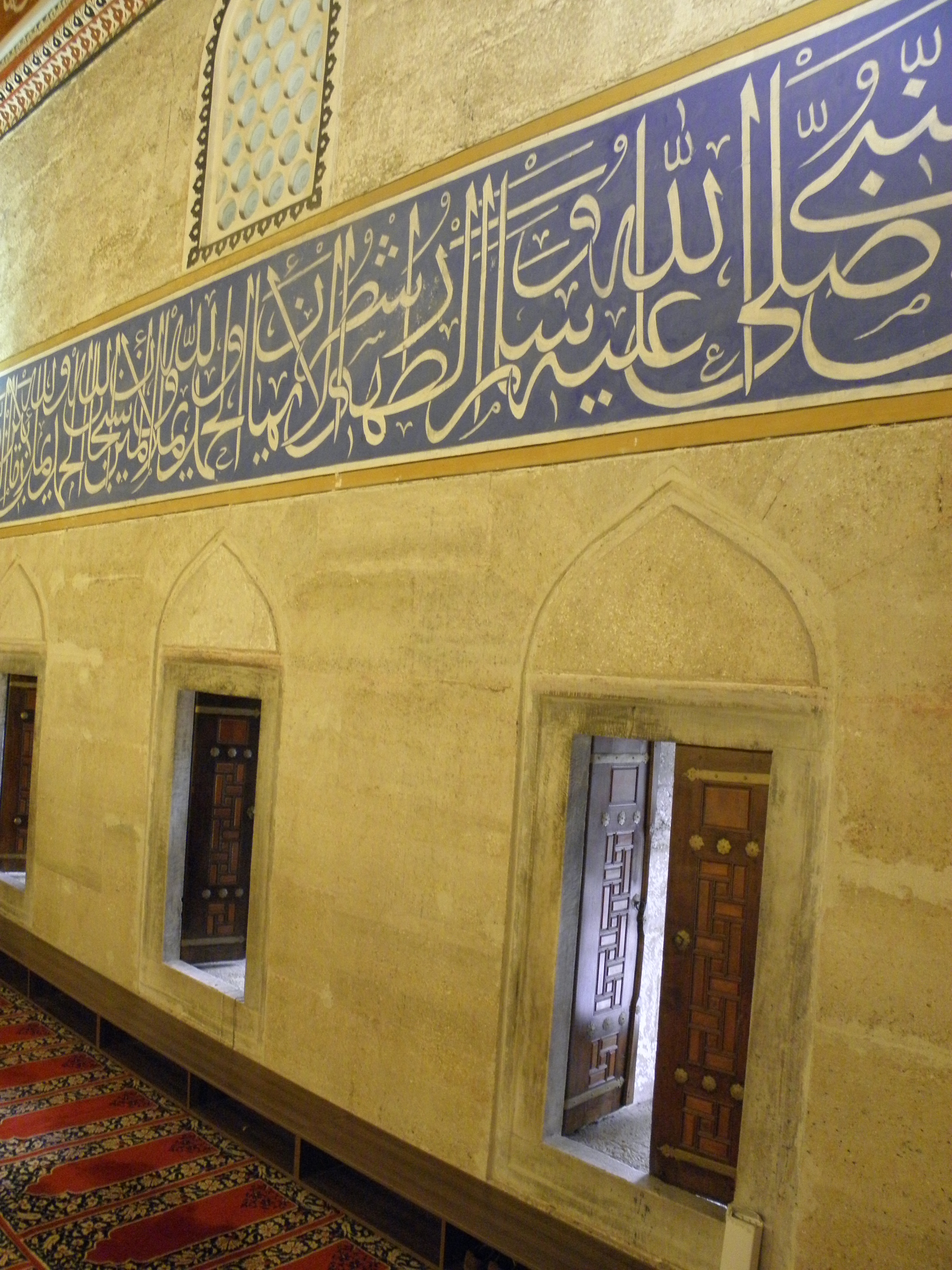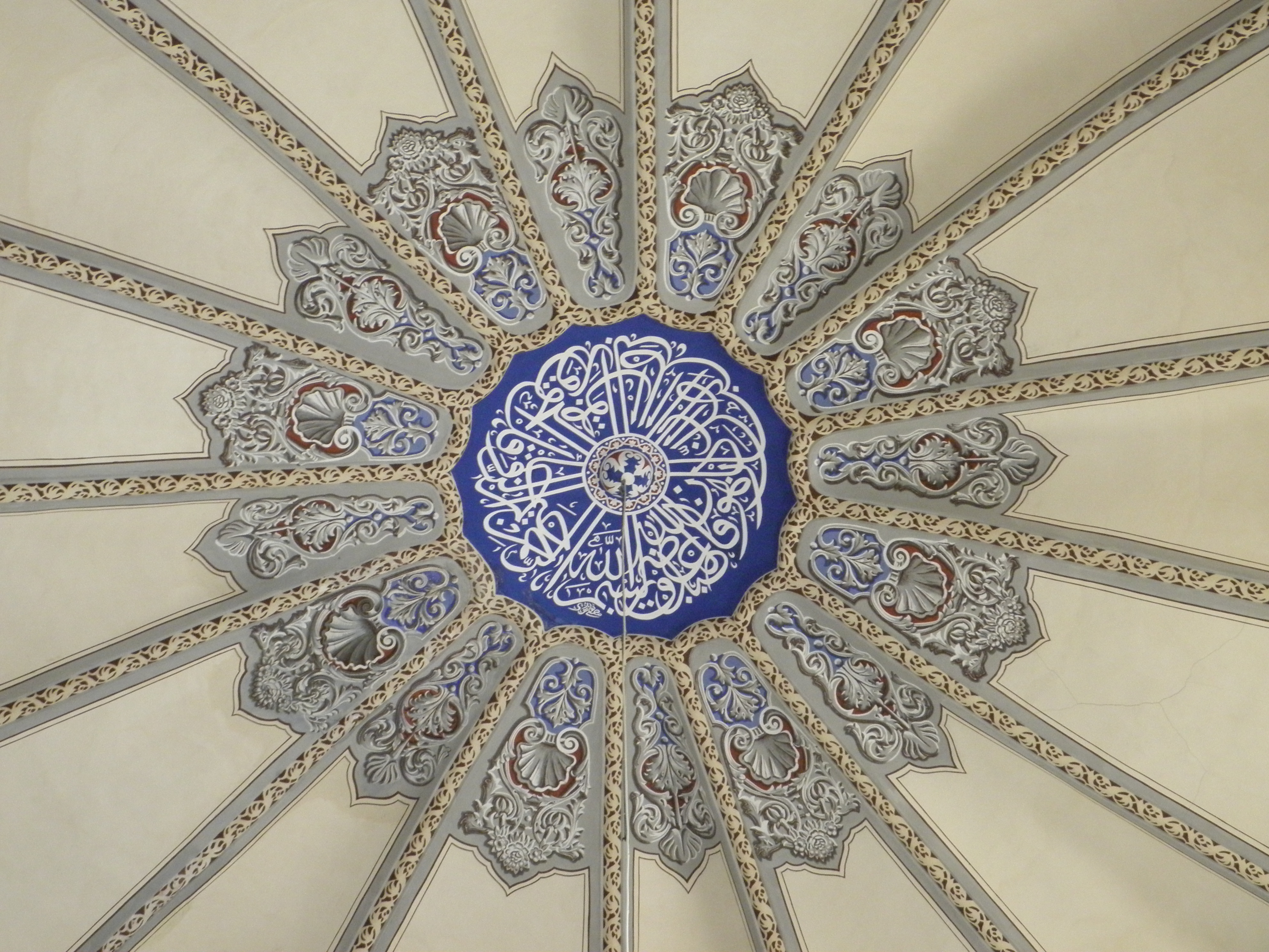 Why is this masjid (=mosque) special? Well, when you see the pictures you will know. We took a day trip down just to see it and were blessed to join the congregation for the noon, afternoon and sunset salah (respectively called ‘dhuhar’, ‘asr’ and ‘maghreb’) there before heading back to Istanbul. It is located in Bursa, a ski-station actually, a beautiful old city located high up in the mountains, overlooked by the towering Ulu-daag (Ulu mountain). The mosque unlike the later masajid (plural of masjid) is decorated in only two colours; black and gold. There is minimal tile work and ornamentation. But what it does have is considered by some as one of the most magnificent displays of Islamic calligraphy in one place. It has over 190 calligraphic panels and works painted on the walls of the mosque. Different verses of the Quran, Islamic phrases, saying of the prophet (peace be upon him). All done in a variety of the established classical styles of calligraphy. For those of you who don’t know, Islamic calligraphy has some classical styles and training in them is also handed down from teacher to student and follows the same ‘ijaza’ (=license) system of transmission. We were blessed to watch a master calligrapher at work, who has ijazaath (plural of ijaza) in I think all the major forms, and some forms took up to 13 years to master. Islamic calligraphy is very mathematical as most Islamic art forms are …unsurprising as Muslim science always considered math to be a language of knowing the divine…there are secrets of the Universe mathematical principles can unlock that no other science can. And I guess in today’s language quantum physics and allied sciences are what I would also consider pure mathematics. But I am going off on another tangent, so I better stop. Look at this interesting paper for a computer application developed to do what the old masters did by hand, exploring symmetry and how it teaches us meanings about origin and end… Here is more detail on the theory.