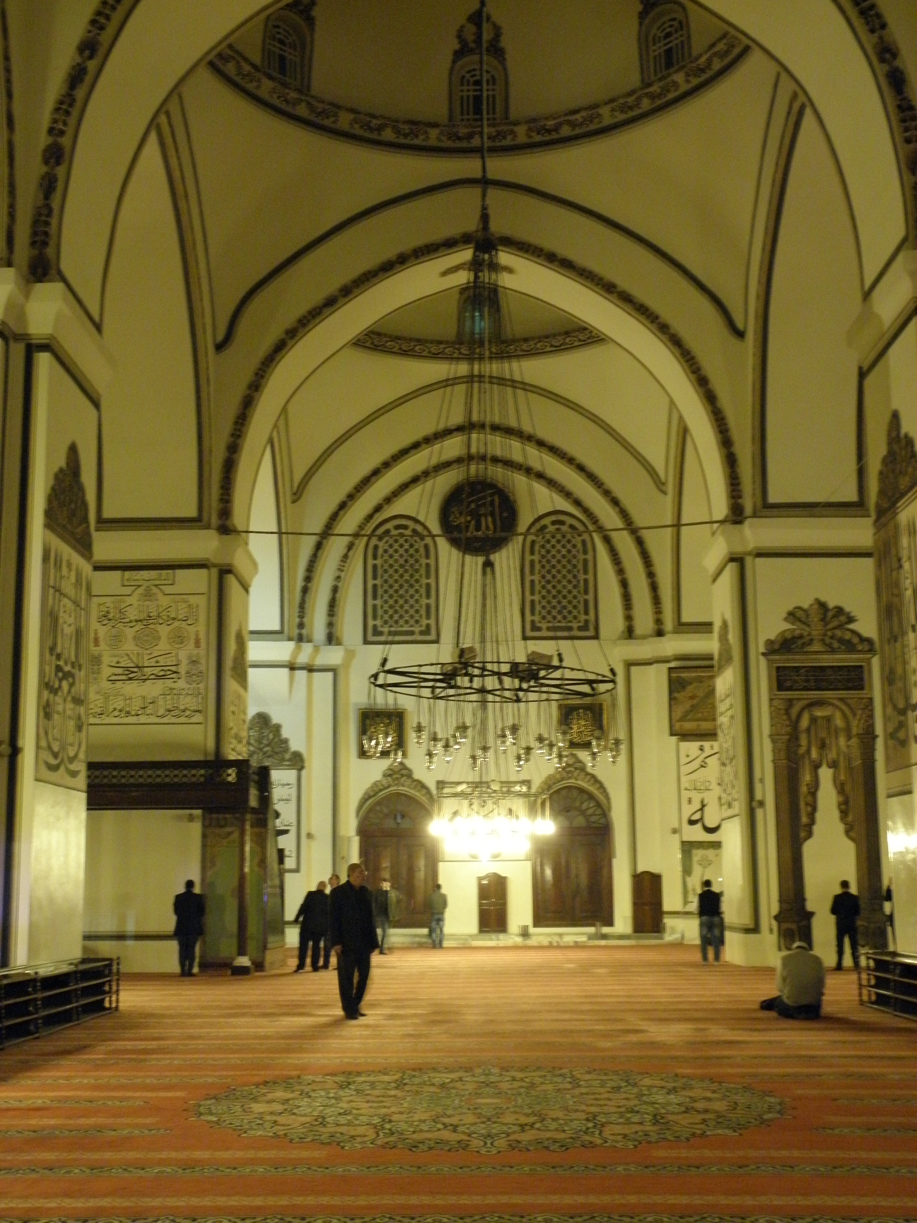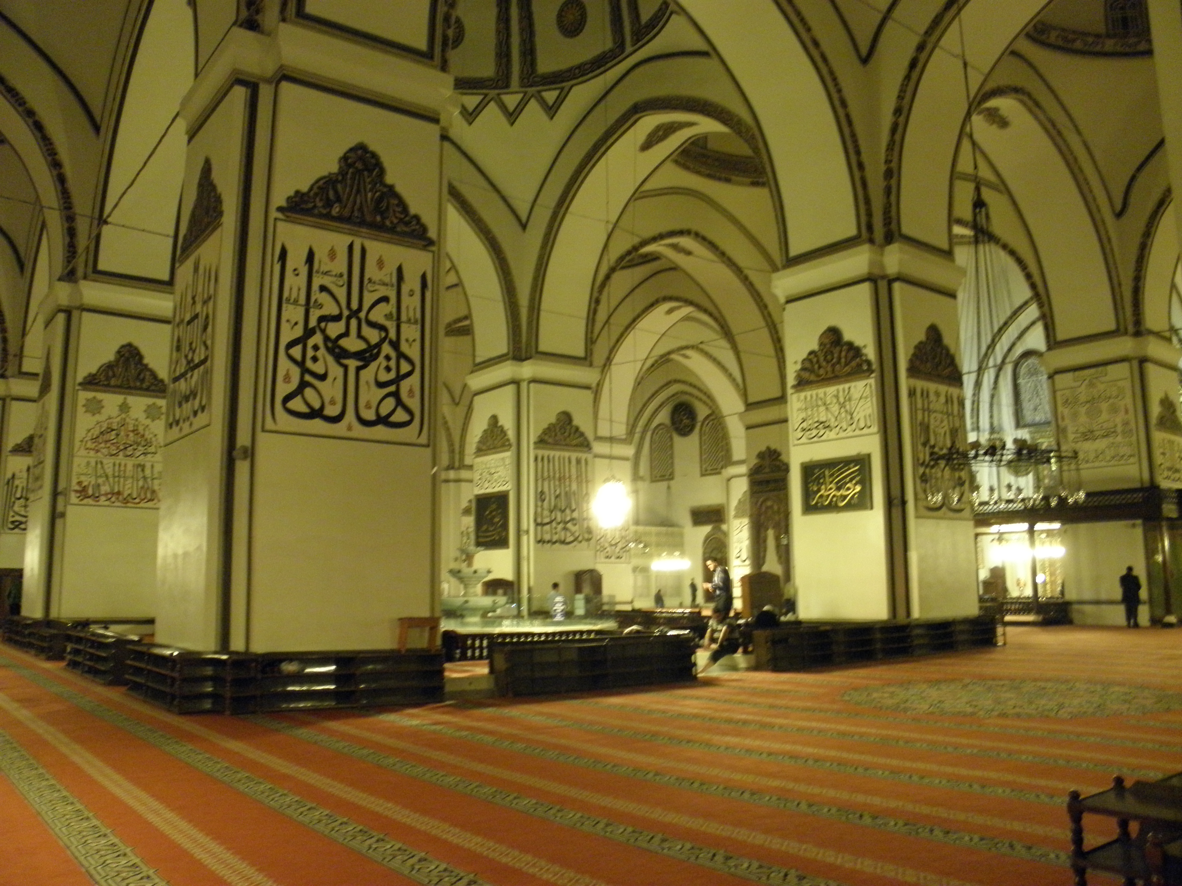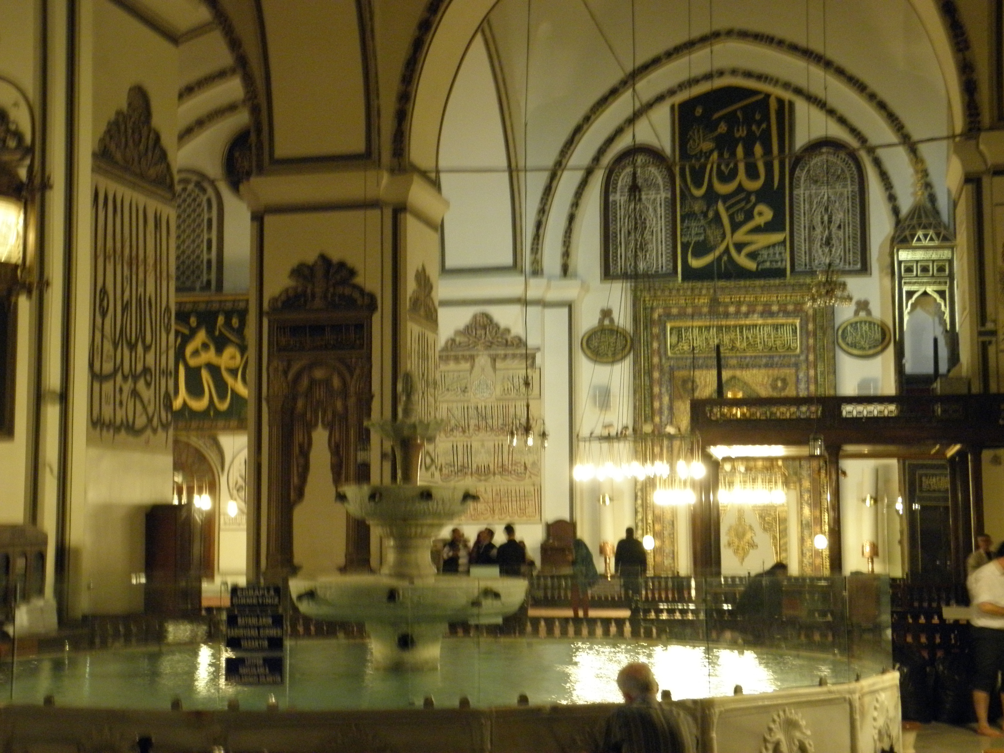 To continue the taps to take the wudu are usually located in the courtyard outside the masjid as we enter the masjid after having taken our wudu. But in the Ulu camii there is a beautiful fountain (complete with fresh clean towels!) located inside the mosque. This was an anomaly and we were curious why. The story goes, that when the Sultan wanted to build the masjid he began to acquire the land for it. All was okay except there was an old lady who lived in this small hut right in the middle of the proposed property who refused to sell to the Sultan. And it is a testament to his good rule that he could not compel her to sell her land. The story goes that eventually she died, and left no heirs. Now the Sultan went ahead and acquired the land and construction was to begin. However here is a dilemma, would the prayer of those worshipers who prayed on this land be valid, in that though acquired it was not done so with the permission of the owner. So according to Islamic law (and remember Islam as a religious tradition is most known in terms of its contributions in the field of law) the land may not be ‘halal’ (permissible) or valid, on which to build a mosque. The ‘ulema (=scholarly community) had a cunning compromise to this dilemma, they could not halt the Sultan from building the mosque but they could not rule that the prayer offered on this portion of the land would be valid according to Islamic law, so they couldn’t sanction it either. Therefore they proposed that a fountain be built on the section of land that used to belong to the old woman so that no worshiper’s head would touch the ground on what maybe a space where a prayer is unlawful. Instead people take their wudu there! I was humbled by this level of scrupulousness and earnestness in trying to find the best solution to a problem not to mention ensuring religious works are done according to the highest morality. And I could not but help think of the status of many Muslim governments of today who don’t care how they do what and would even murder their own citizens in the name of religion. May God help us all.